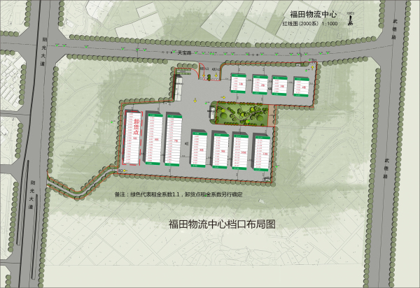 青口物流中心、福田物流中心一個(gè)檔口面積約277㎡,其中室內72㎡,大車(chē)裝貨區148㎡,小車(chē)卸貨區57㎡,租金為550元/年﹒m2。