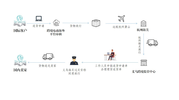 該業(yè)務(wù)在消費者發(fā)起退貨申請,經(jīng)平臺審核后,轉關(guān)至義烏跨境監管中心,后通過(guò)合法申報的方式把海外買(mǎi)家退訂的貨物運輸回國內賣(mài)家。