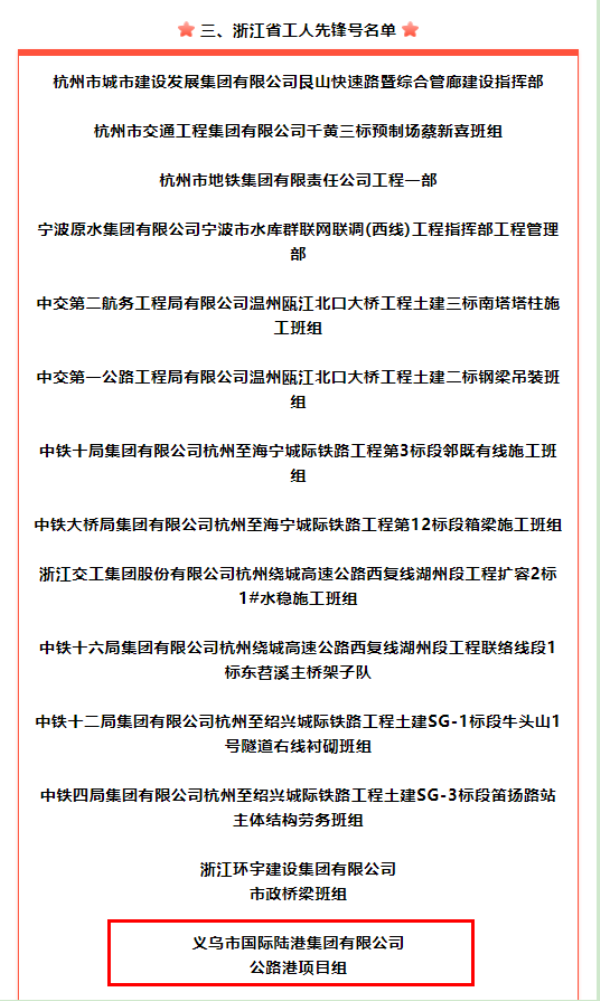 今日,一個(gè)好消息從浙江省總工會(huì )傳來(lái),義烏市國際陸港集團有限公司公路港項目組榮獲“浙江省工人先鋒號”稱(chēng)號,成為建功新時(shí)代,積極投身“重要窗口”建設的先進(jìn)團隊之一!