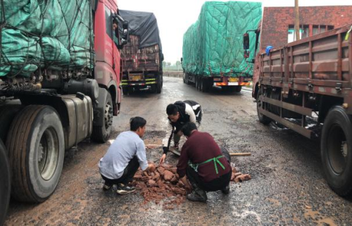 “晴天一片土、雨天一片泥、大車(chē)不敢走、小車(chē)過(guò)不去”過(guò)去青口物流園外圍陽(yáng)光大道一直給經(jīng)營(yíng)戶(hù)“添堵”,一到下雨天路面坑洼嚴重,經(jīng)常造成園區車(chē)輛行駛緩慢交通堵塞。為此,第一分公司組建了“物流先鋒隊”,對路面情況進(jìn)行實(shí)時(shí)監管,第一時(shí)間聯(lián)系施工單位對路面進(jìn)行修補,聯(lián)合交警部門(mén)對交通進(jìn)行疏導,同時(shí)化身“筑路工”,對路面進(jìn)行簡(jiǎn)單修補。