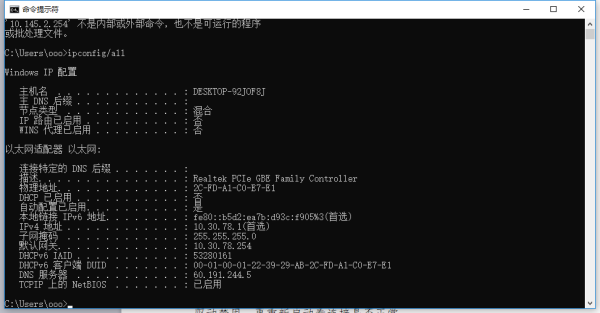 3)在cmd下輸入“ ping 10.30.78.254”(網(wǎng)關(guān)地址)