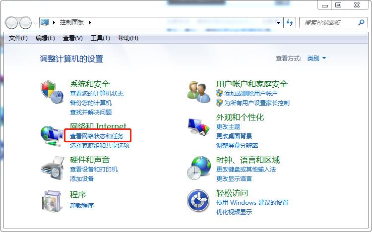 ②然后在控制面板中選擇“網(wǎng)絡(luò )和Internet”下的【查看網(wǎng)絡(luò )狀態(tài)和任務(wù)】: