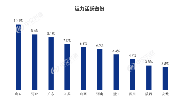 從活躍運力數據看,已經(jīng)形成了長(cháng)三角、環(huán)渤海、珠三角、成渝四大經(jīng)濟區,運力排名前十的省份分別為山東、河北、廣東、江蘇、山西、河南、浙江、四川、陜西、安徽,均是大經(jīng)濟區的中心,總占比達到64.1%。