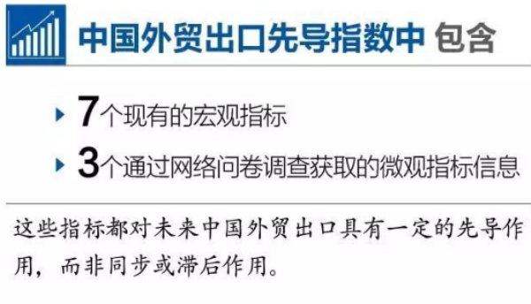 中國外貿出口先導指數中,包含7個(gè)現有的宏觀(guān)指標、3個(gè)通過(guò)網(wǎng)絡(luò )問(wèn)卷調查獲取的微觀(guān)指標信息,這些指標都對未來(lái)中國外貿出口具有一定的先導作用,而非同步或滯后作用。