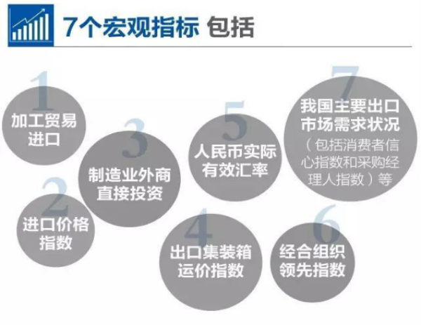 7個(gè)宏觀(guān)指標包括加工貿易進(jìn)口、進(jìn)口價(jià)格指數、制造業(yè)外商直接投資、出口集裝箱運價(jià)指數、人民幣實(shí)際有效匯率、經(jīng)合組織領(lǐng)先指數和我國主要出口市場(chǎng)需求狀況(包括消費者信心指數和采購經(jīng)理人指數)等。