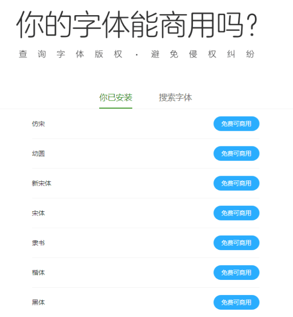 今天就和大家推薦一款能夠用于查詢(xún)的小工具:360查字體。該工具主要有兩大功能,一是可以一鍵檢測電腦上的已有字體,顯示哪些是“免費可商用”?哪些是“商用需授權”?二是如果你還想查一下別的字體能否商用,可以在該工具上搜索指定字體,查看該字體的版權范圍。