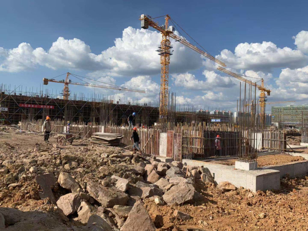 8月1日上午9:30,室外氣溫已超37度,但在公路港二期項目的施工現場(chǎng),十余輛重型卡車(chē)來(lái)回穿梭,建筑工人們冒著(zhù)酷暑依舊在緊張有序地工作。