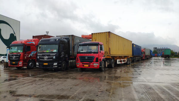 等待進(jìn)場(chǎng)的中歐班列集裝箱車(chē)隊有序停放。