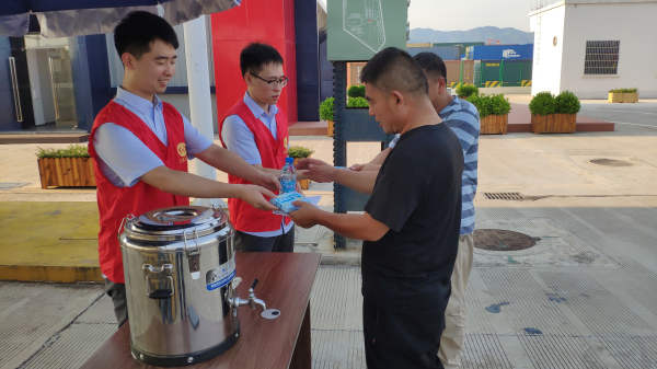 昨日,陸港鐵路口岸員工開(kāi)展送清涼活動(dòng),為司機送上飲用水和防暑藥品。