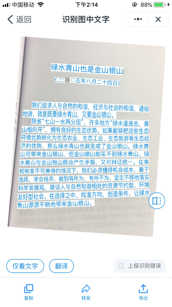 傳圖識字:拿出手機拍張照片,自動(dòng)轉換成文字,還可以點(diǎn)擊中英文翻譯。