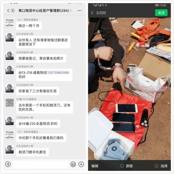“各位經(jīng)營(yíng)戶(hù),經(jīng)常在物流園區偷盜的慣犯抓住啦!目前已聯(lián)系江東派出所民警處理,被偷的經(jīng)營(yíng)戶(hù)可向民警登記,領(lǐng)回失竊財物?!苯?jīng)過(guò)多方連日努力,14棟客戶(hù)經(jīng)理通過(guò)三級微信作戰群向失竊經(jīng)營(yíng)戶(hù)傳達了這一喜訊,及時(shí)為經(jīng)營(yíng)戶(hù)追回手機、生活用品、貨物等,切實(shí)保障了經(jīng)營(yíng)戶(hù)的財產(chǎn)安全,為經(jīng)營(yíng)戶(hù)吃下“定心丸”。