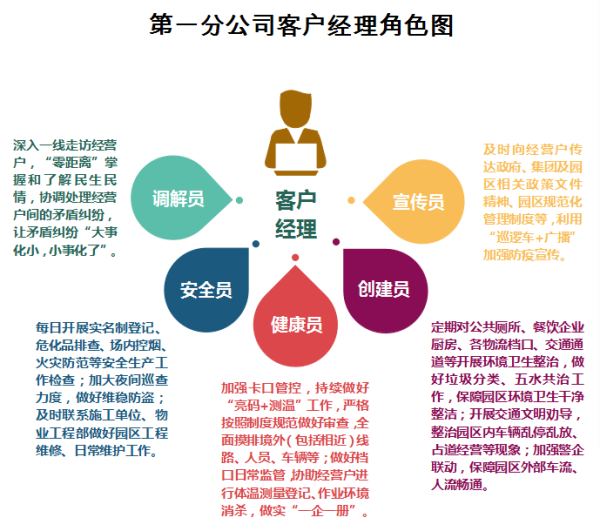 “客戶(hù)經(jīng)理制”是將“黨建+單元”三級作戰指揮長(cháng)與首辦責任人合二為一,同時(shí)發(fā)動(dòng)物業(yè)管理人員、物業(yè)服務(wù)人員、安保人員、維修人員、經(jīng)營(yíng)戶(hù)代表共建共治,精準高效提升園區管理服務(wù)水平和治理效能的新舉措。