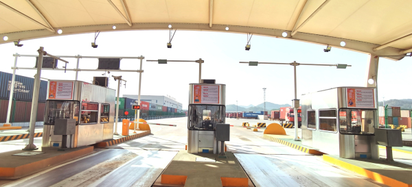 遠遠地,我就看見(jiàn)崗亭上方貼著(zhù)啥,原來(lái)是三張廉潔服務(wù)承諾書(shū),公示了卡口、窗口、現場(chǎng)服務(wù)工作人員的服務(wù)標準??诠ぷ魅藛T根據司機大哥給的進(jìn)場(chǎng)單,幾十秒的功夫就核驗完畢,并按下了抬桿鍵。