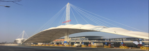 園區主出入口為兩個(gè)跨度120m、高22.5m的膜結構,設計美觀(guān)、氣勢宏大
