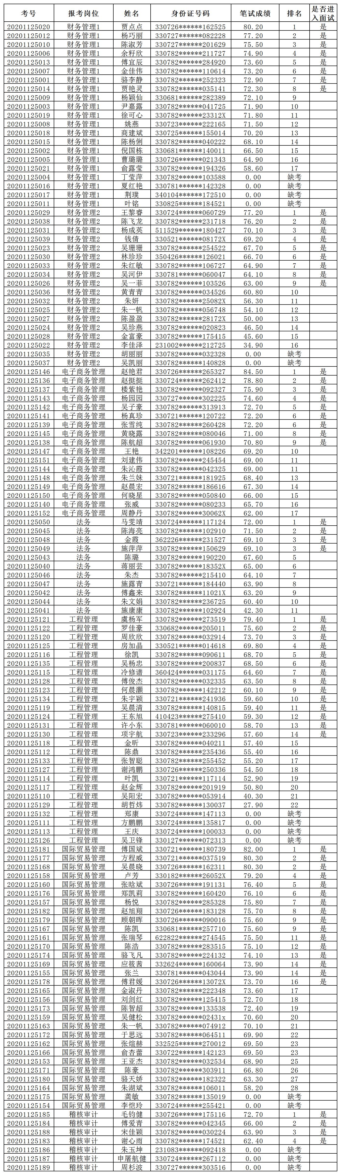 義烏市國際陸港集團有限公司2020年秋季人才招聘筆試已結束。根據筆試成績(jì)從高分到低分,按招聘計劃數1:3的比例確定入圍面試人員,招聘計劃數大于等于4人的崗位按1:2的比例確定入圍面試人員?,F將筆試成績(jì)及入圍面試人員名單公布如下: