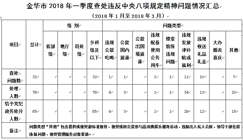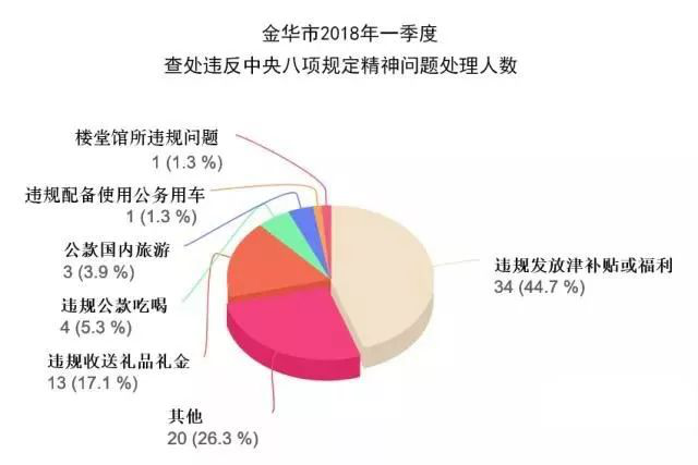 2018年1-3月,金華市累計開(kāi)展正風(fēng)肅紀專(zhuān)項行動(dòng)681次,累計查處違反中央八項規定精神問(wèn)題32起,處理76人,其中黨紀政務(wù)處分65人。從查處的問(wèn)題類(lèi)別看,“違規發(fā)放津補貼或福利”的問(wèn)題最為突出,處分34人,占查處總人數的44.74%,居第二位的是“其他類(lèi)”問(wèn)題,處分20人,占查處總人數26.32%,其中集中表現為提供或接受超標準接待等現象。居第三位的是“違規收送禮品禮金”問(wèn)題,處分13人,占查處總人數17.11%。