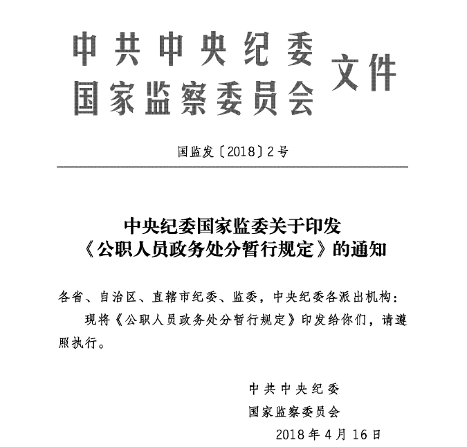 2018年4月16日,中央紀委國家監察委印發(fā)《公職人員政務(wù)處分暫行規定》。