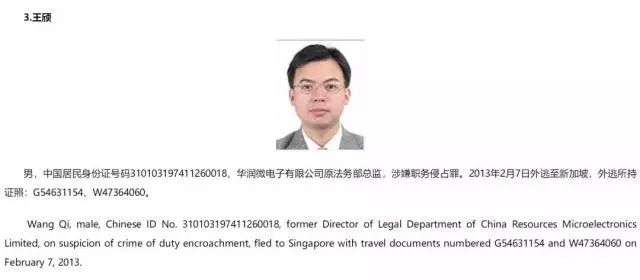 王頎,男,1974年出生,華潤微電子有限公司原法務(wù)部總監,涉嫌職務(wù)侵占罪,于2013年2月外逃新加坡。國際刑警組織紅色通報號碼為:A-5422/8-2013。