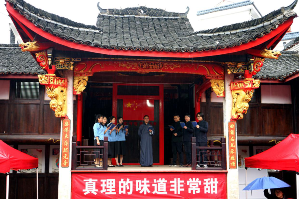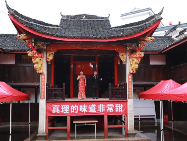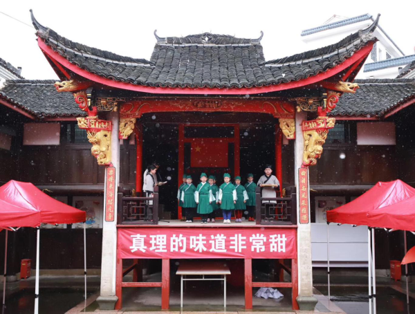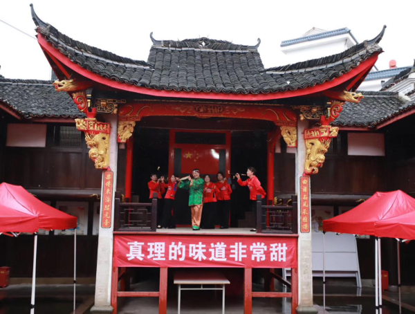 信仰“味道”追憶百年崢嶸歲月“全世界無(wú)產(chǎn)者聯(lián)合起來(lái)!”在分水塘村的另一邊,一道洪亮的聲音響起,原來(lái)是旅游公司支部自編自導的情境詩(shī)朗誦節目正在演出,再現了百年前千秋巨筆陳望道先生首譯《共產(chǎn)黨宣言》,粽蘸墨汁錯當紅糖的軼事,詮釋信仰之甜、精神之甘;作為青少年研學(xué)基地,集團專(zhuān)程邀請中國傳統文化促進(jìn)會(huì )組織學(xué)齡孩童,著(zhù)漢服、行禮節,一聲聲稚嫩的“老師好”,傳播千年孝義文化。此外,婺劇、舞蹈、小品等節目讓村民應接不暇,紅歌唱響更將現場(chǎng)氣氛推向高潮。
